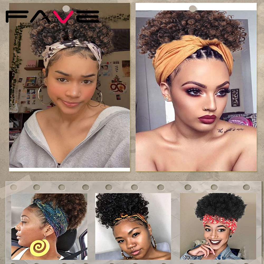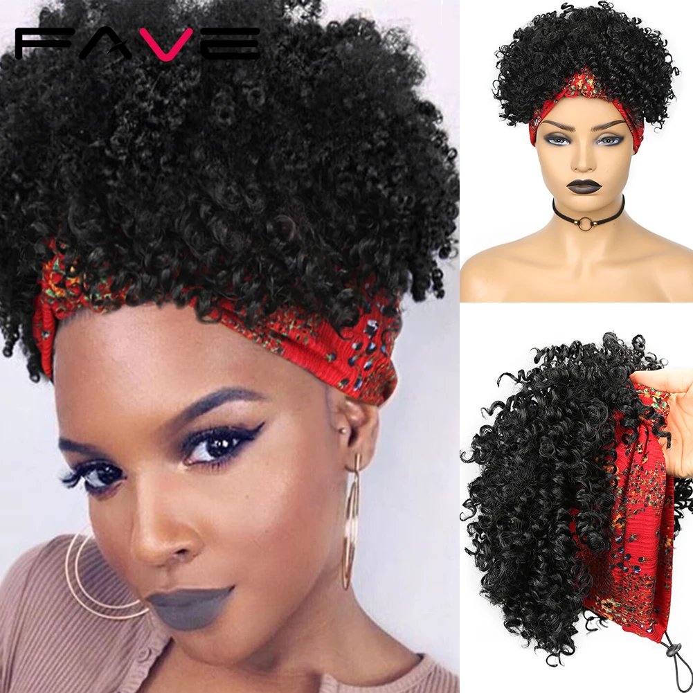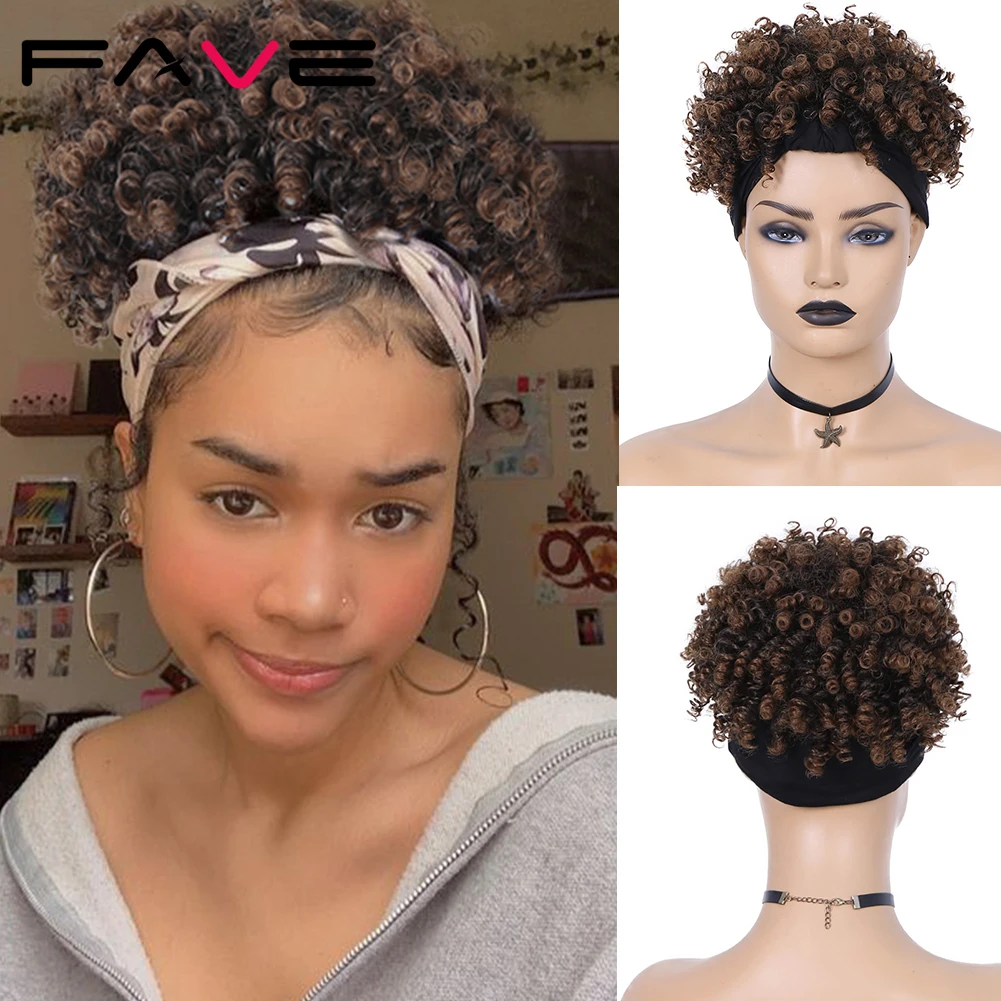 FAVE Headband Wig Afro Kinky Curly Black Turban Ombre Brown Synthetic Hair Band Heat Resistant Fiber For Black White Women